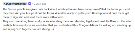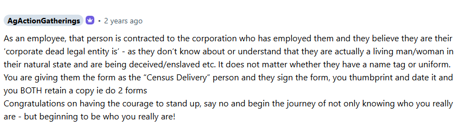 As part of AAG’s content, HMP circulated “Living Lore” guidance encouraging others to reject the national census. The material framed census staff as agents of the “system” and instructed people to hand over bespoke “Living Lore” documents instead. These materials were punctuated by a caution that they were powerful on a “gut and spirit level” and not to mix them with other [sovereign] “legal’ systems. The form was to be produced in duplicate, preferably in red ink, with a claim that it would “change everything” and allow individuals to step into “freedom”. Thus infering that ordinary state obligations were really methods of control, while recasting refusal as the path to empowerment, not unlawful behaviour. She goes on to give advice about what to do if the census workers follow up on non-returns (see below) which includes “educating them”.