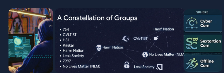 As well as the names above other subgroups exist but branding can change or new subgroups emerge quickly. Other numerical codes are used as group names include 2992, 6996, 545, 404. and 303. These groups often use symbols from Neo-Nazi or Satanic extremist groups, however this can be for shock value and intimidation rather than a true belief in what they stand for. These subgroups tend operate from three pillars depending on their motivations: Cyber com, Sextortion Com, and Offline com but there can be overlap.