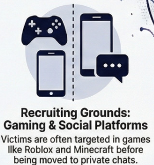 Perpetrators use popular games like Minecraft and Robolox, or other online mainstream spaces to access vulnerable individuals.