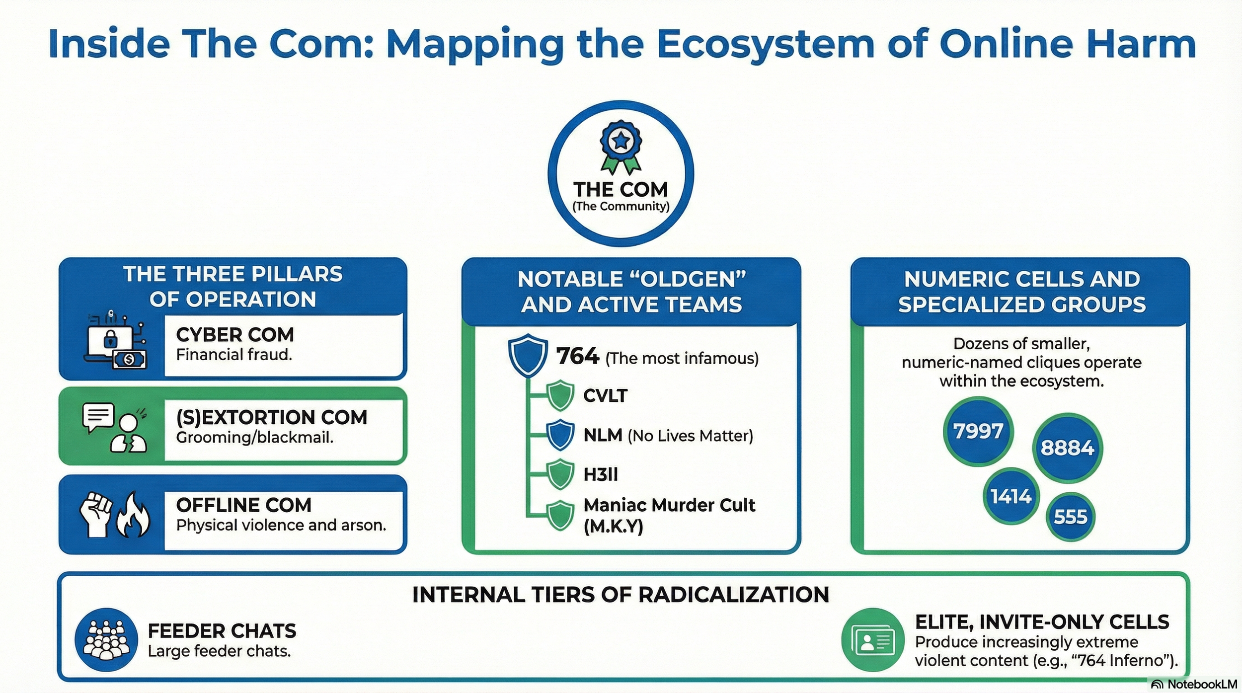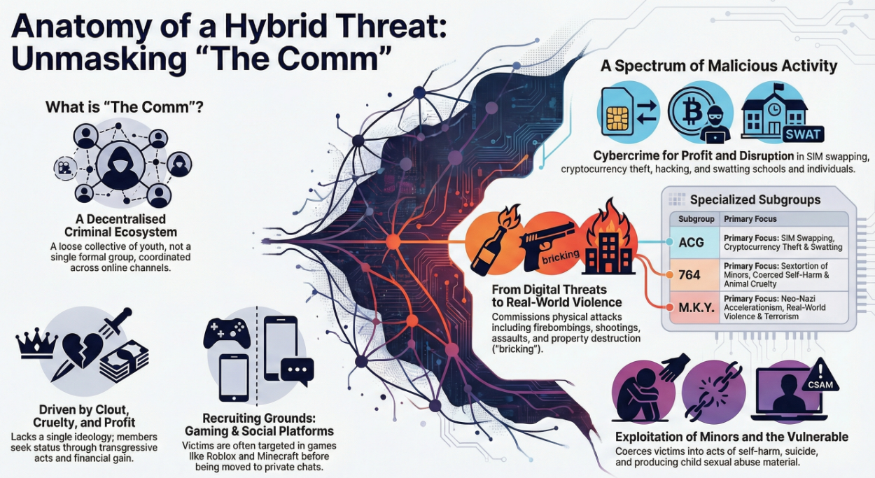"The Com" (or "The Community") is a vast, interconnected network of digital spaces spanning both mainstream and encrypted platforms. This ecosystem consists of overlapping servers and forums that, while distinct, share a unified culture centered on anti-social behavior. Within this ecosystem, sub groups and members collaborate and compete, creating a volatile environment where activities frequently escalate into criminal behaviour and violent extremism.